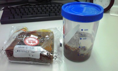 会社に帰って、540プロテイン(Soy:WPC=3:1)20gの野菜ジュース割りと、菓子パン1個と、エスプレッソを摂取した。