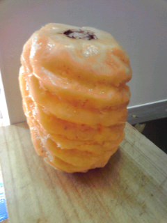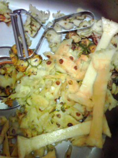 縦において、上から包丁で皮をそぎ落とす。最初、ケチって薄くむいたため、皮の緑色のところが残ってしまったので、後からちまちま緑のところだけそぎ取った。めんどい。ちょうど,茶色のボツポツだけが残るようにそぎ落とすのがベスト。