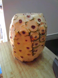 パイナップルを手に持ってりんごの芯を取るような感じで茶色のポツポツをとっていく。このときらせんになるようにきっていくと綺麗。2個ポツを一度に切り取ろうとするとなかなかうまく行かなかったので1個ずつ処理した。