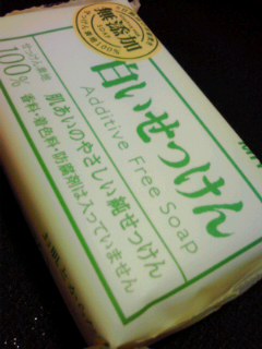 ダイエーで新しい無添加石鹸をみつけたので買ってきた。今までのと比べると、色が白くて硬く泡が軽い(泡に弾力がない)。説明書きによれば、色が白いのは精製度の高い食用グレードの油を使っているかららしい。においは洗濯用の石鹸と同じにおい。あたりまえか。http://shop-miyoshisoap.jp/ec/product/323/511031