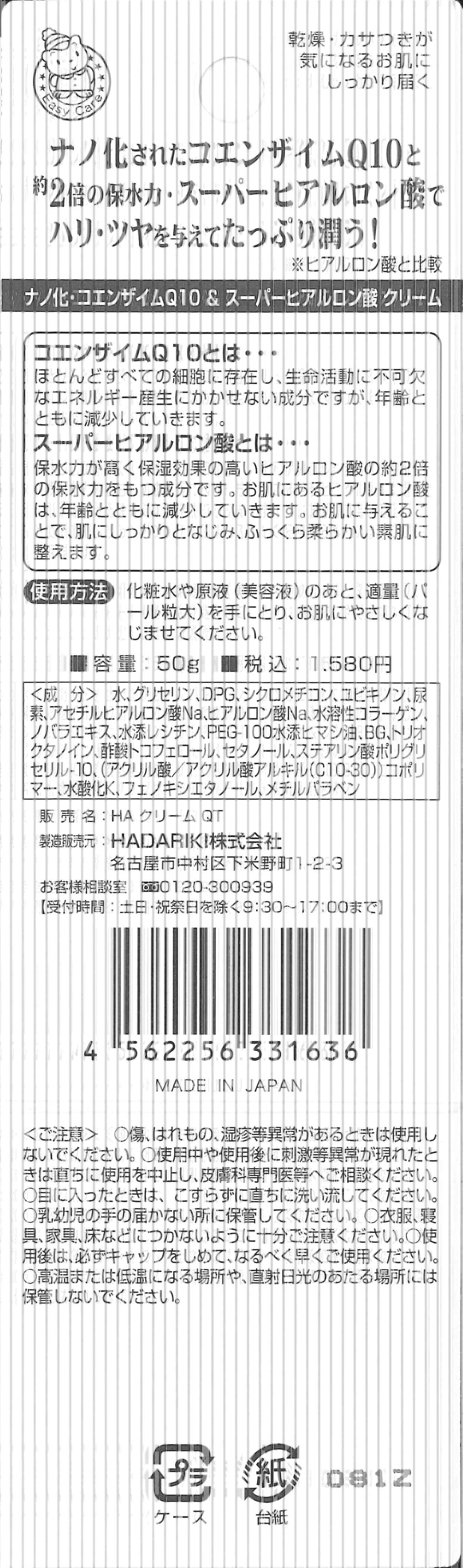9189c6eb.jpgHADARIKI(株)のやつ。ナノ化コエンザイムQ10&スーパーヒアルロン酸クリーム 50 399円。定価は1580円だけど、そもそも化粧品ってボッタクリだしな、定価はあてにならない。手にとるときの感触は弾力がある。肌にはすんなりのびる。あまりオイルの感じはない。