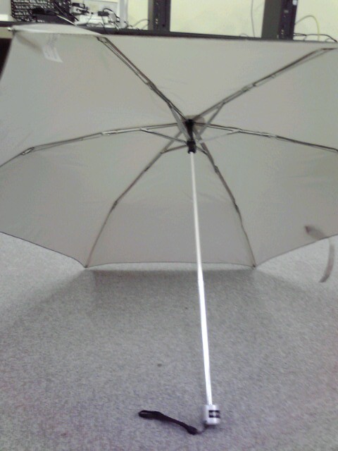 で、折り畳み傘525円を買ったんだけど、小さめでこれは子供用だろうという感じだ。メーカーはスーパーの人に外してもらったのでわからないが"water front(R)"と書いてある。生地は厚めでハリがある。骨が軽くて張力が弱いのを補っているのかなぁと想像したり。