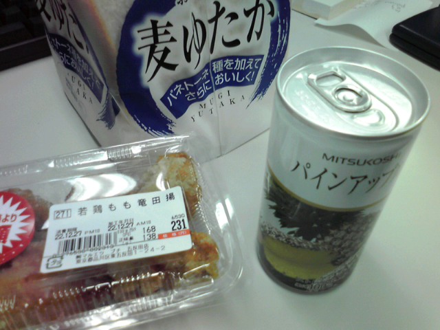 終わった後の捕食はストレート(濃縮還元じゃないよ!)パイナップルジュース、鶏の竜田揚げ、ブドウ糖20g入り緑茶、食パン1枚(ハチミツがけ)。