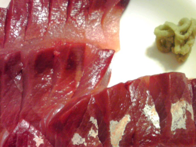 ダイエーのおいしくたべたい国産丸大豆しょうゆ(濃口、特級)とくらべてみた。左が醤油、右がたまり。なんとなくたまりのほうが色が濃くてすそが広がってないところから粘度が高いのがわかるかと。刺身につけていただきました。