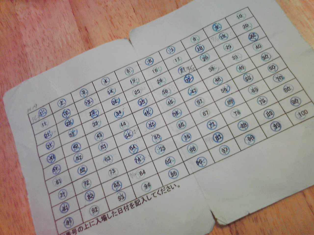 今日はついにスタンプが100集まった! 最初が2007年1月13日だから平均すると2週間に1回は泳ぎに来ていることになる。おもったよりも来てるんだなぁ。月1回くらいかとおもってた。事務室にもっていってエコトートバッグをもらった。3色の中から深緑を選択。記念にスタンプをもっていってもいいというので持ち帰る。でも印もなにもついてないのでもう一度もっていったらまらもらえちゃう?