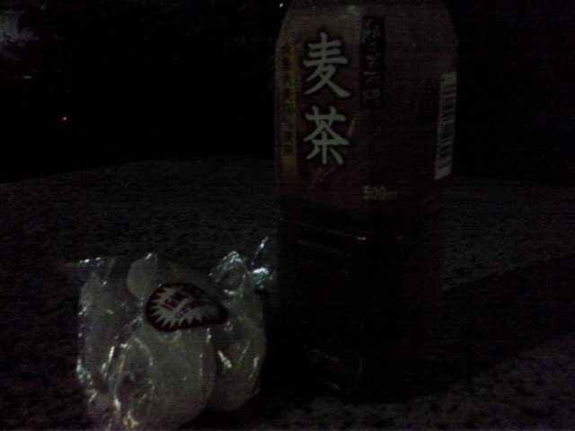 練習後の補食は大福と麦茶(橋の上で)。会社に戻ってからプロテイン。