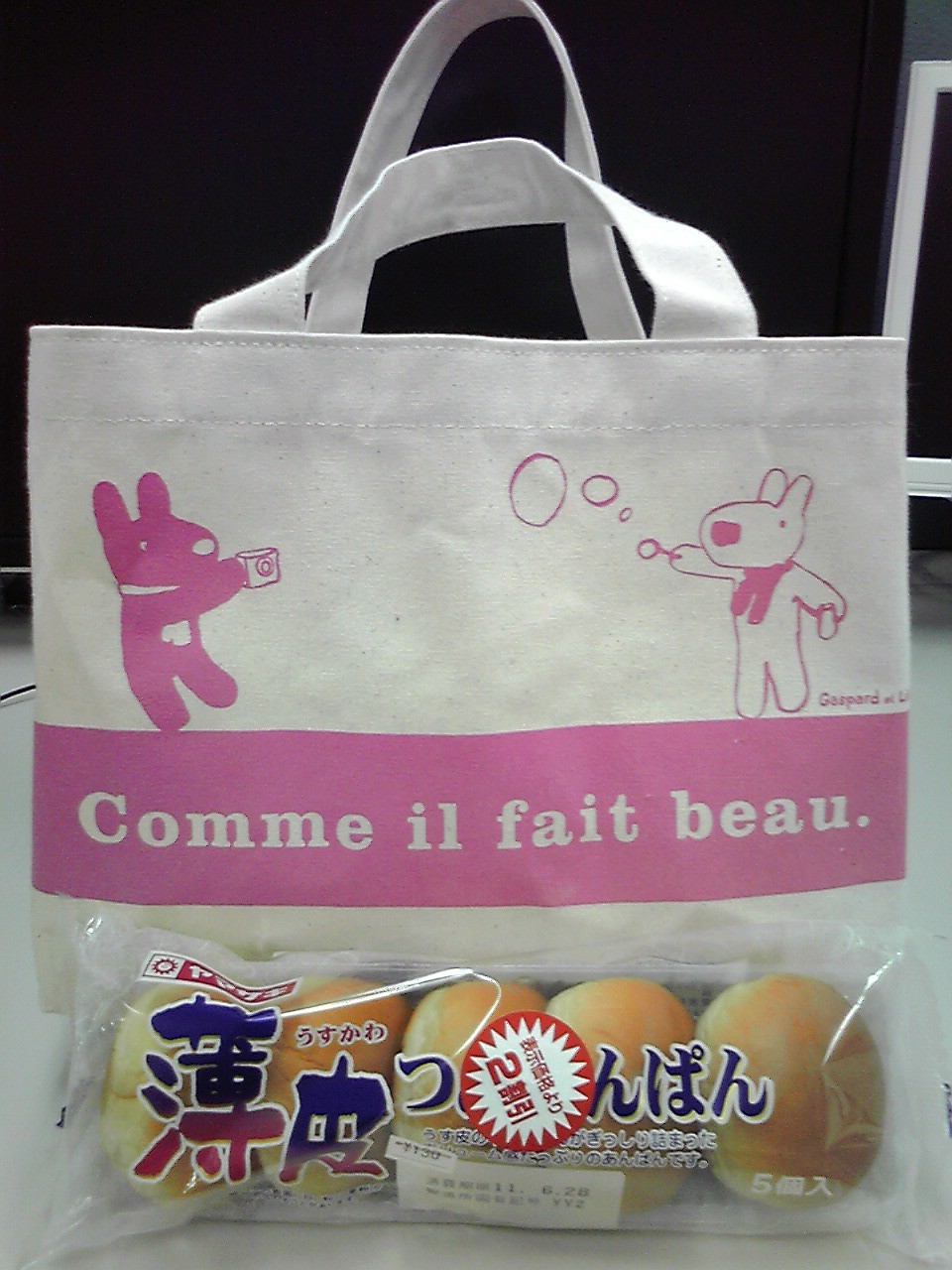 練習後の補食はプロテイン20gと薄皮つぶあんぱん(690kcal,たんぱく18.5g,脂質3.5g,炭水化物146g)。バックのバッグはパスコのシールでもらったやつ。今日から水泳用具をいれる鞄としてつかうことにした。