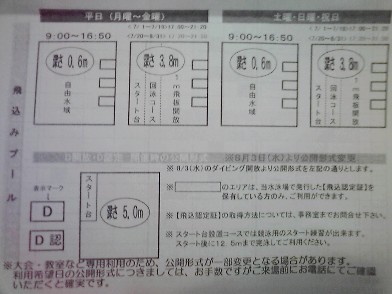 ダイビング開放で水深5mになっているときは、今までは回泳コースとスタート台コースがあったが、12.5mのスタート台コースだけになった。距離を短く制限することで飛び込んでから潜行する距離的余裕をなくすということだった。