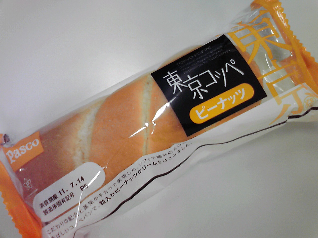 練習後の補食: プロテイン30g, パスコ 東京コッペ ピーナッツ(493kcal,たんぱく11.5g,脂質20.7g,炭水化物65.2g)。しっかりした歯応えだった。