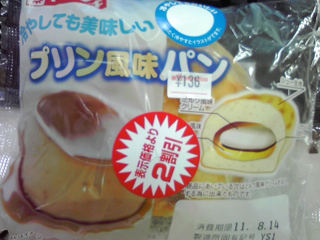 「冷やしても美味しいプリン風味パン」はよくあるホイップ系のかんじ。(363kcal,たんぱく質7.3g,脂質10.9g,炭水化物58.8g)