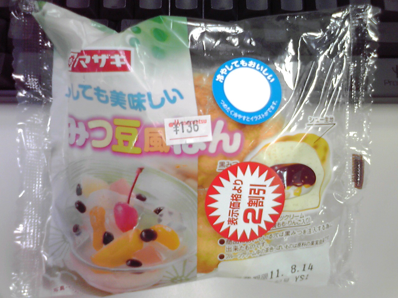 泳いだあとはもってきたアイスコーヒーをゴクゴク。糖分を入れてくるのを忘れてブラックコーヒー。そのあとスーパーによって菓子パン ヤマザキ「冷やしても美味しいみつ豆風パン」(325kcal,たんぱく質6.8g,脂質9.4g,炭水化物53.2g)。ガツンと甘くて甘いもの好きにはたまらない感じだ。風味もよろしい。