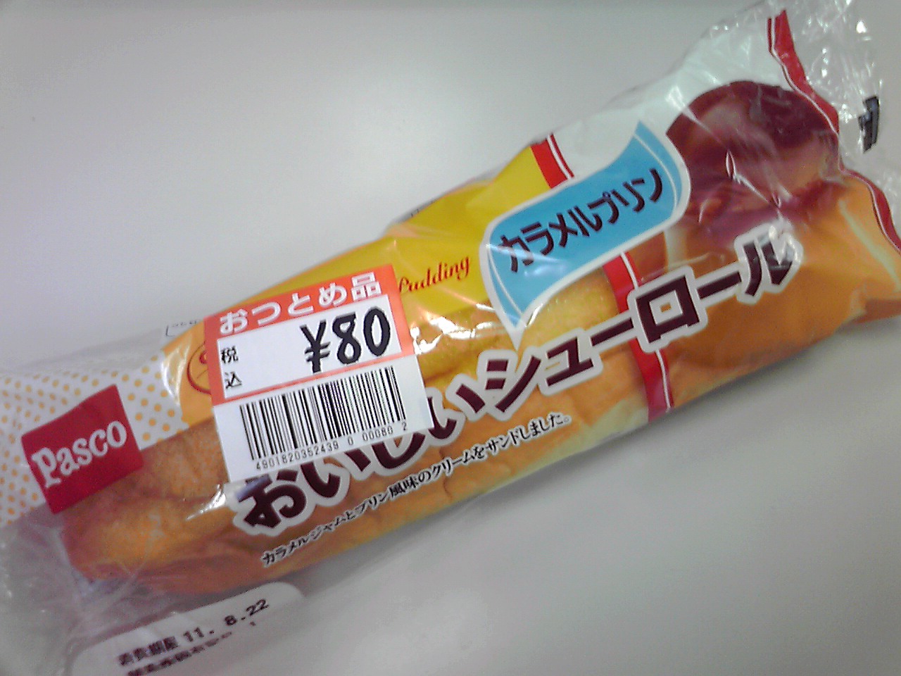 練習後の補食: プールにプロテインをもっていったので終わってすぐプロテイン20g+ブドウ糖20g。そのあと、えび煎餅とPasco「おいしいシューロールカラメルプリン」(388kcal,たんぱく質8.4g,脂質12.7g,炭水化物59.9g)。
