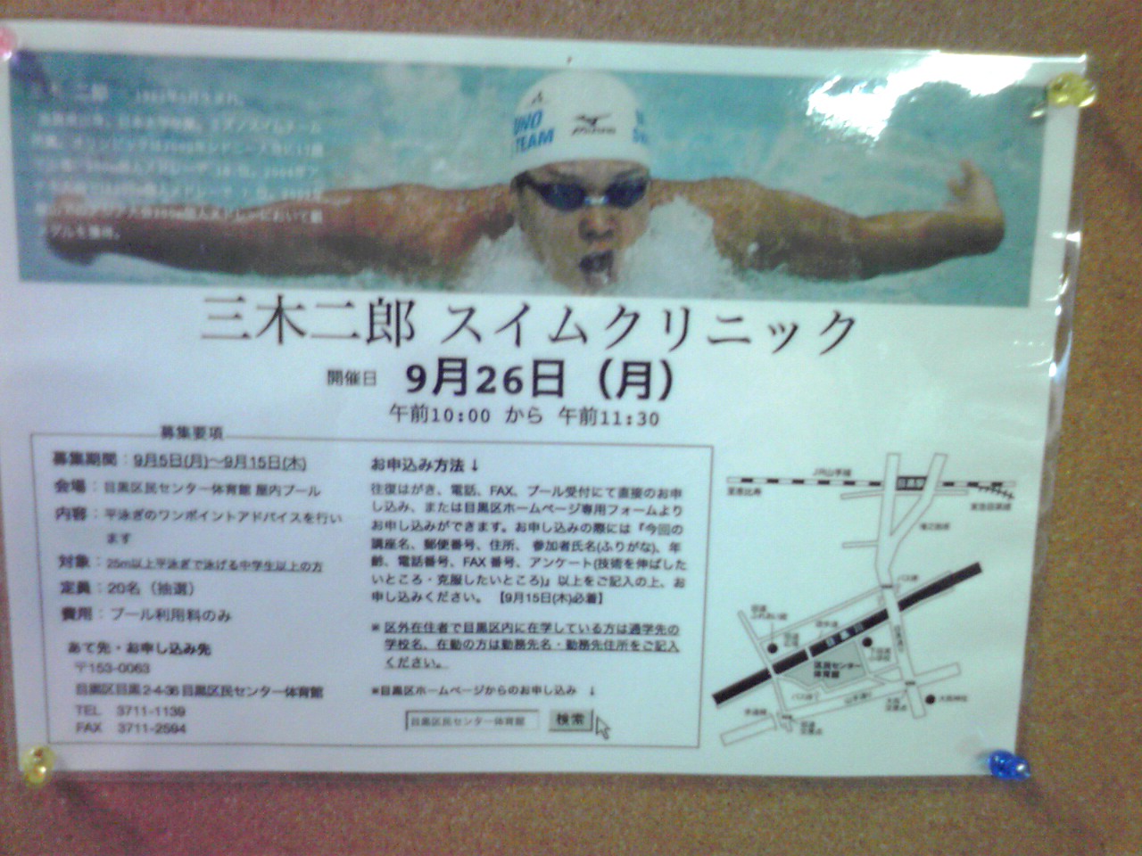 三木二郎スイムクリニックの案内がはってあった。平泳ぎのワンポイントレッスンがあるらしい。でも在住・在勤・在学の人に限られるっぽいな、明記してないけど。そもそも社内会議があるからムリだわ。だれかに住所を貸してもらおうかとおもったけどあきらめがついた。
