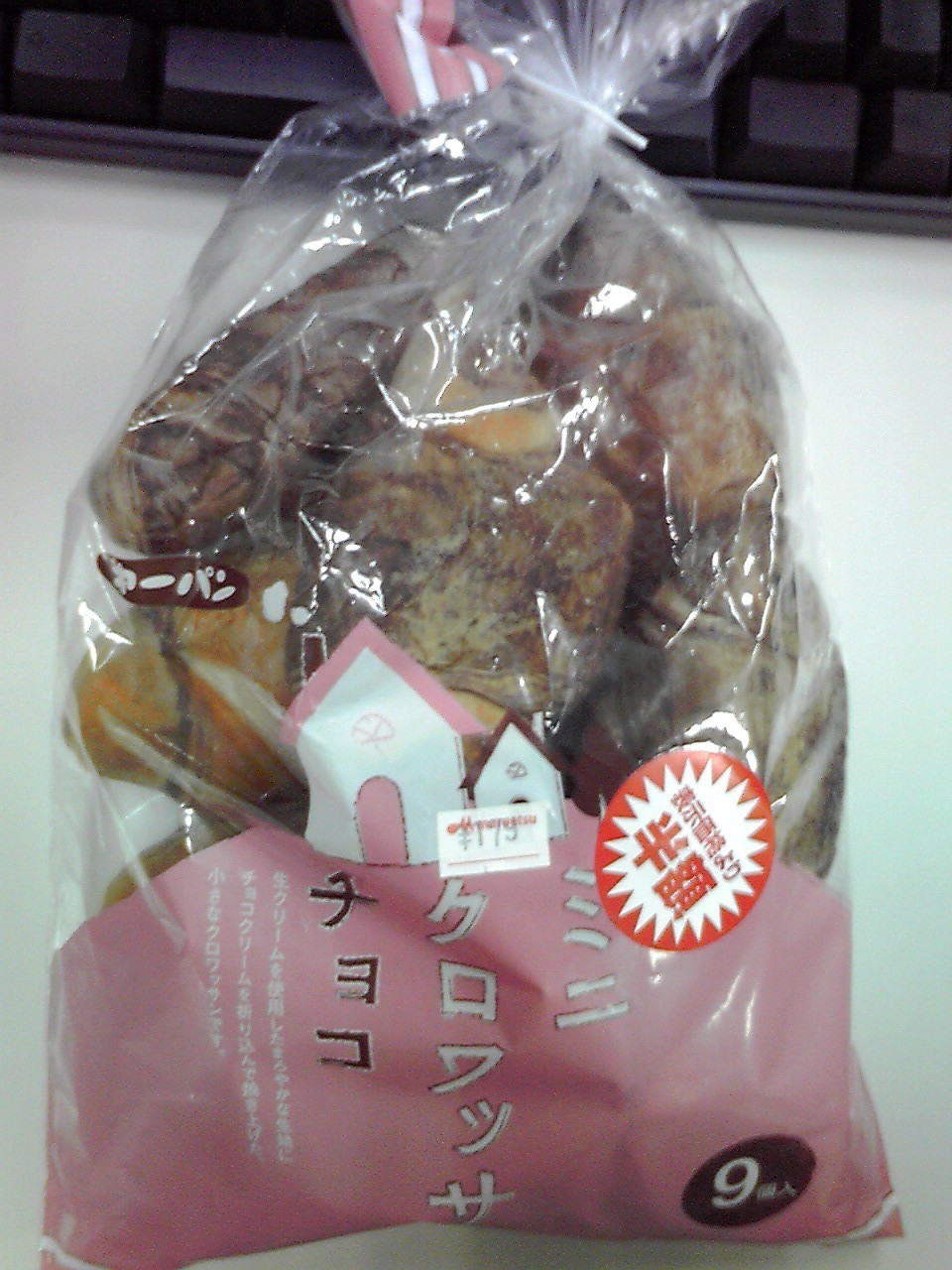 練習後の補食はプロテイン15g+ブドウ糖15g、第一屋製パン(株)ミニクロワッサン チョコ ((65kcal,たんぱく質1.4g,脂質2.0g,炭水化物10.1g)*9)。裏面をみたらパッケージデザイン協力:武蔵野美術大学(MΛU)とかいてあった。