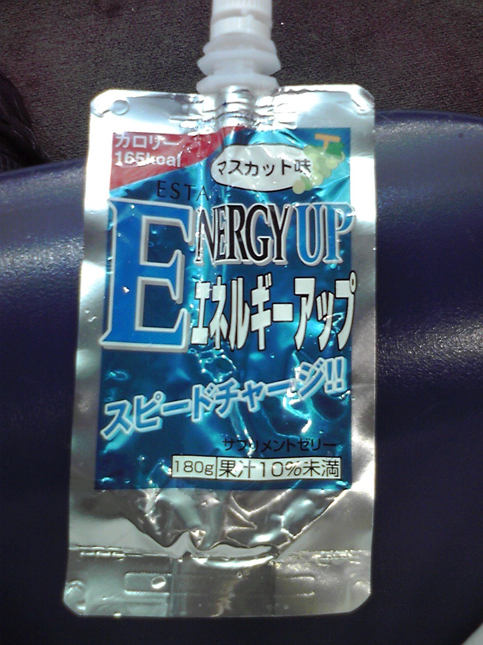 ダウンをすませて観覧席にもどると、チームメンバーからゼリー飲料をいただく。エネルギーアップ マスカット味 (165kcal,たん白質0g,脂質0g,炭水化物41g)。炭水化物が多かったけどあまくないなぁとおもったら原材料がマルトデキストリン、果糖ぶどう糖液糖、…となっていた。ぶどう糖果糖液糖じゃないところもみそか。運動前/運動中のエネルギー補給系か。