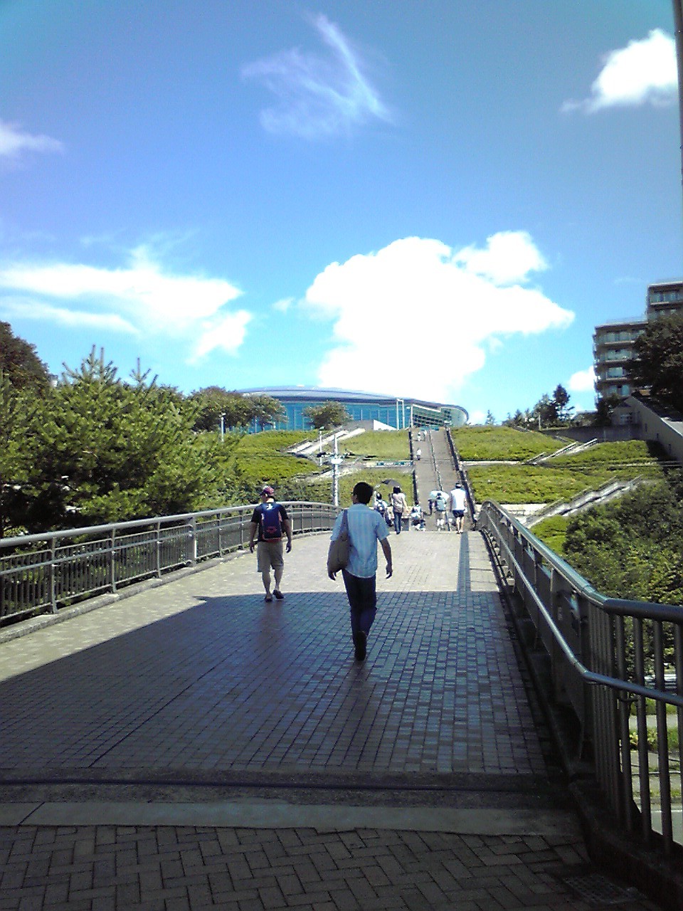 昼飯/おやつ・野菜ジュース・ビタミン剤・水着・ビート板・パソコンをもって9時ごろ出発。台風が近づいているので昨日は雨だったが今日は晴。北山田(きたやまた not だ)駅から横浜国際プールへの階段がアツい!