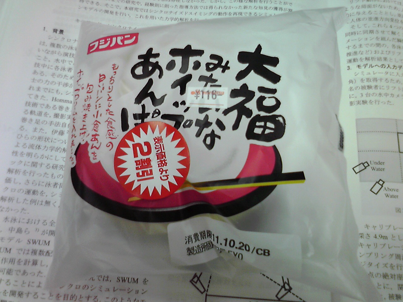 練習前のおやつ: 大福みたいなホイップあんぱん(368kcal,たんぱく質7.0g,脂質9.9g,炭水化物62.6g)。