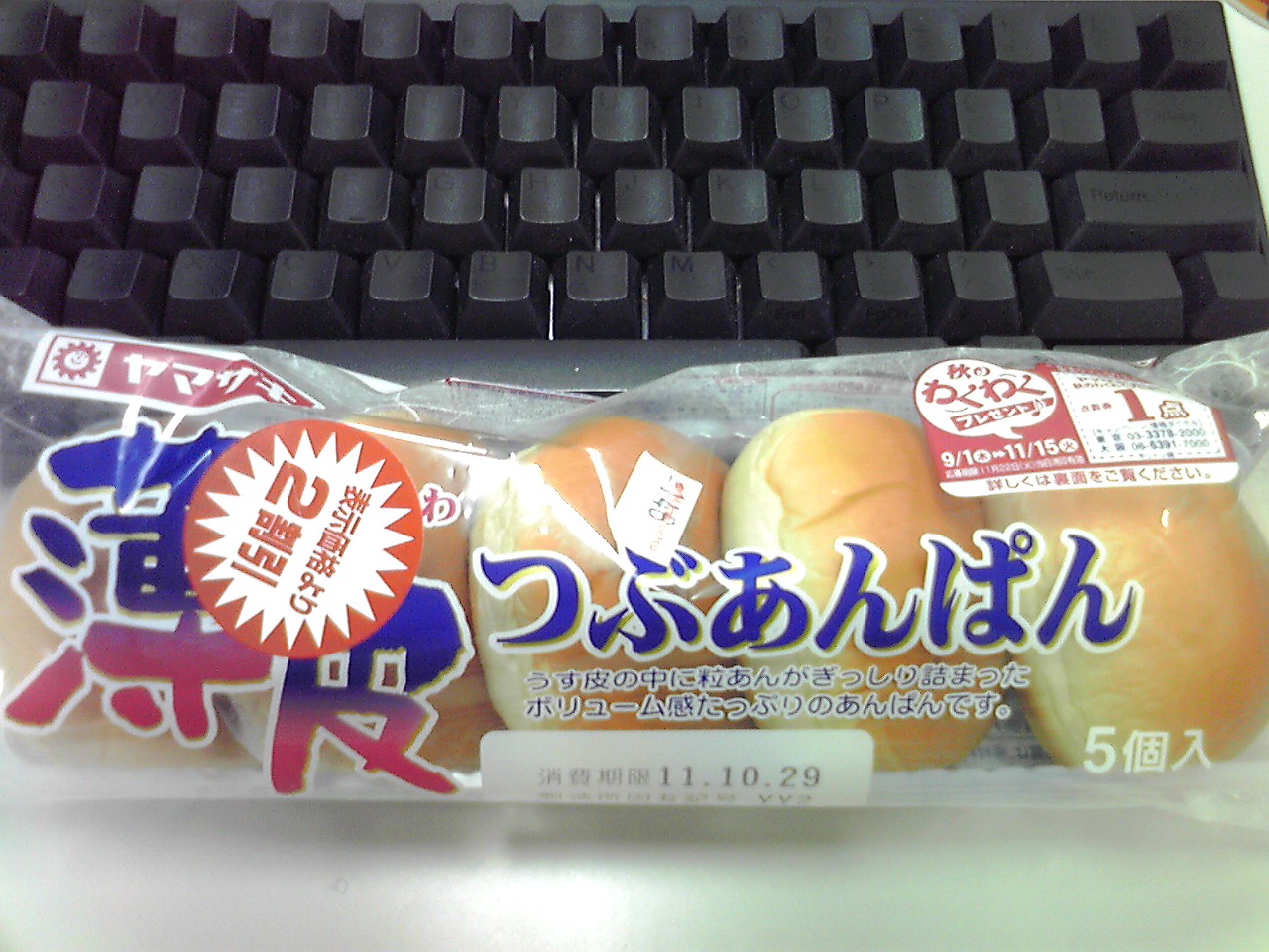 練習後の補食: プロテイン15g+ブドウ糖15g, ヤマザキ薄皮つぶあんぱん(5*(123kcal,たんぱく質3.0g,脂質0.7g,炭水化物26.1g))。脂質がすくなくて練習後には最適。