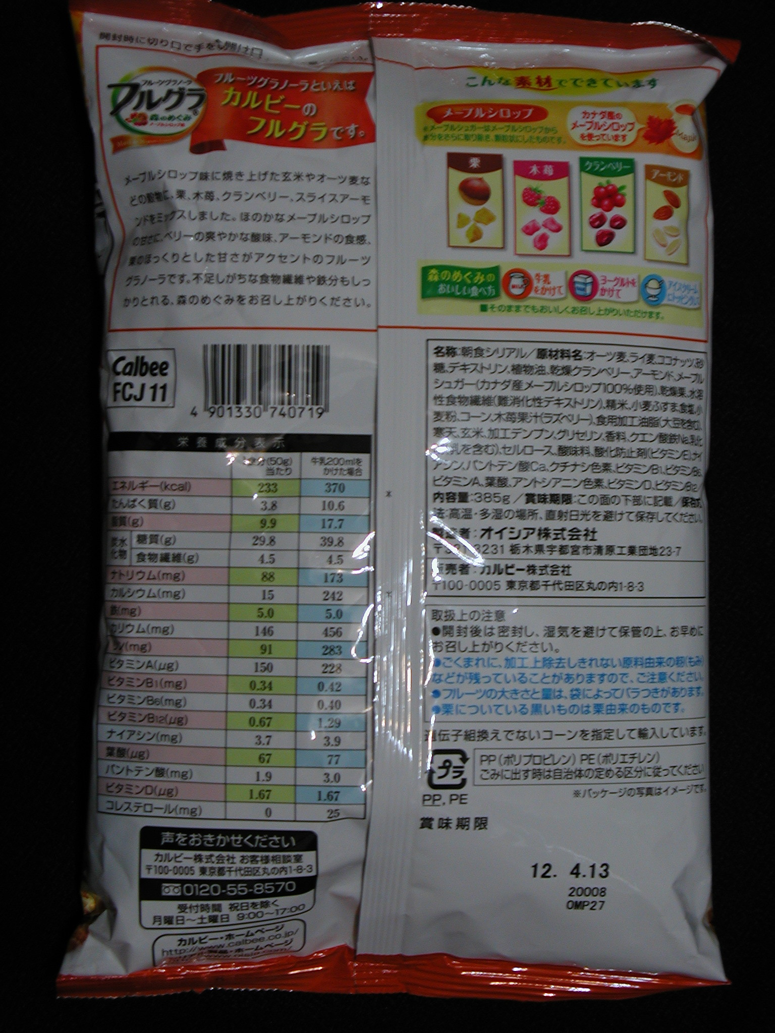 カルビー フルグラ 森のめぐみをかってみた。メープルシロップのかおりがする。でも味はいまいちかなぁ。ふつうのフルグラと比較してフルーティーさはまったくなくて、もごもごしたかんじ。まぁ森のイメージには合ってるかもしれん。