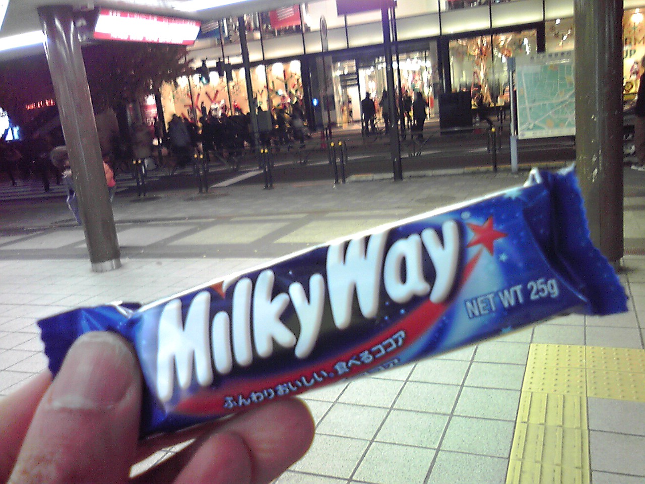 練習後の補食はプロテイン25g+原宿駅のコンビニでチョコレート ミルキーウェイココア(111kcal,たんぱく質0.7g,脂質3.8g,炭水化物18.3g/80円)を買って食べた。エネルギー単価で考えると菓子パンの3倍くらいの値段だ。スニッカーズはかなりしっかりした食べ応えに対して、ミルキーウェイはやわらかキャンディーといった感じだろうか。