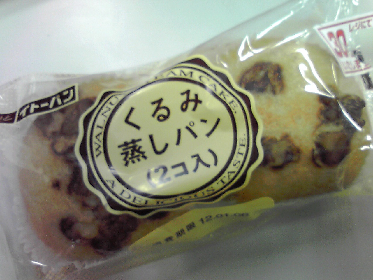 練習後の補食: プロテイン30g、イトーパン くるみ蒸しパン(321kcal,たんぱく質4.4g,脂質18.9g,炭水化物33.4g)x2。和菓子なのに脂質が多いな。食べたあとの口のなかがべとっとするのは植物油脂のせいか?