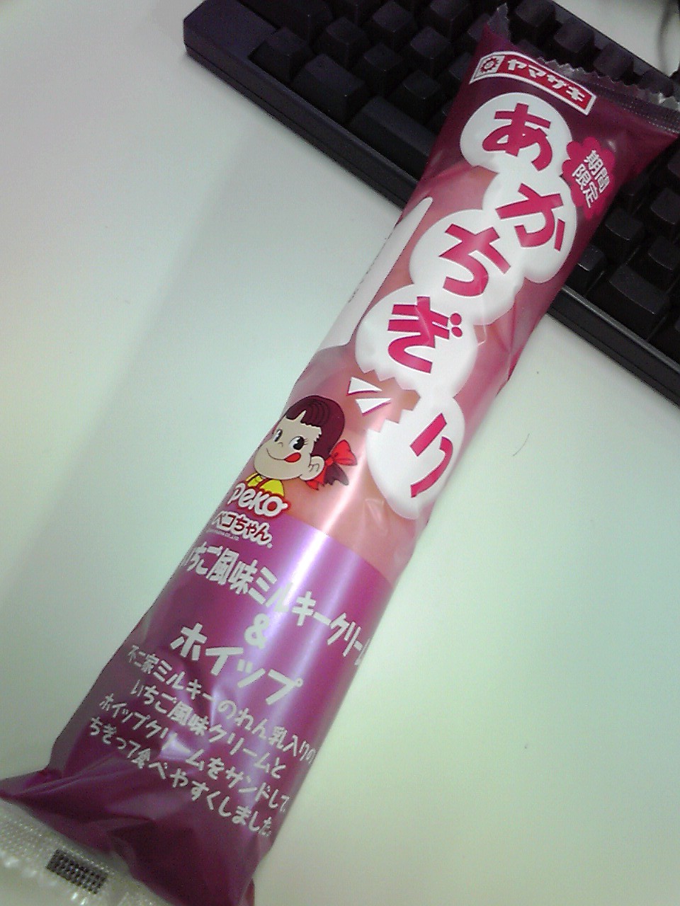 練習後の補食: プロテイン20g、ヤマザキ あかちぎり(いちご風味ミルキークリーム&ホイップ)(418kcal,たんぱく質9.5g,脂質13.3g,炭水化物65.1)。よく考えたらこれも不二家だな。