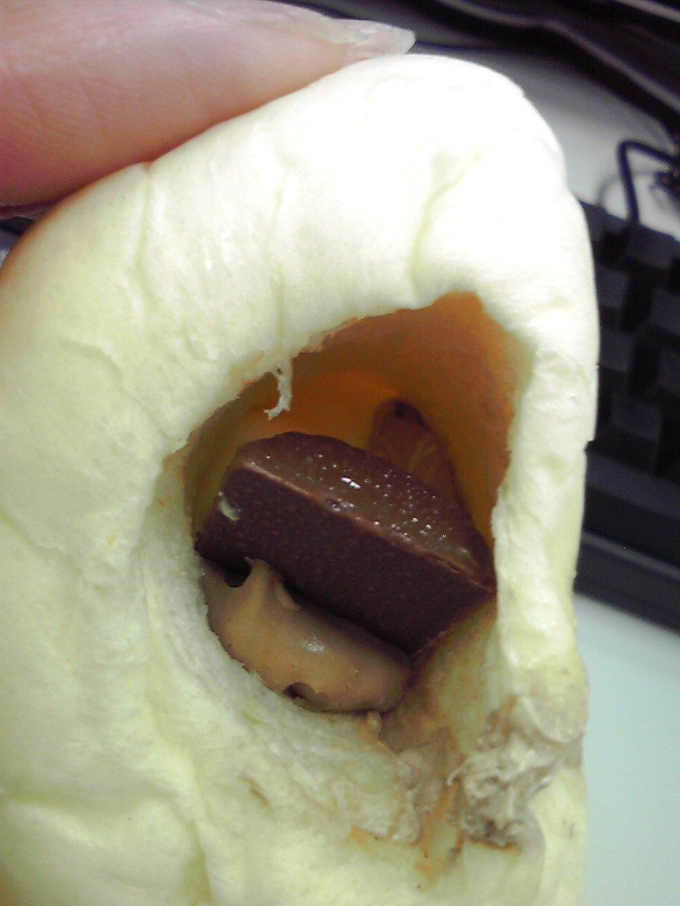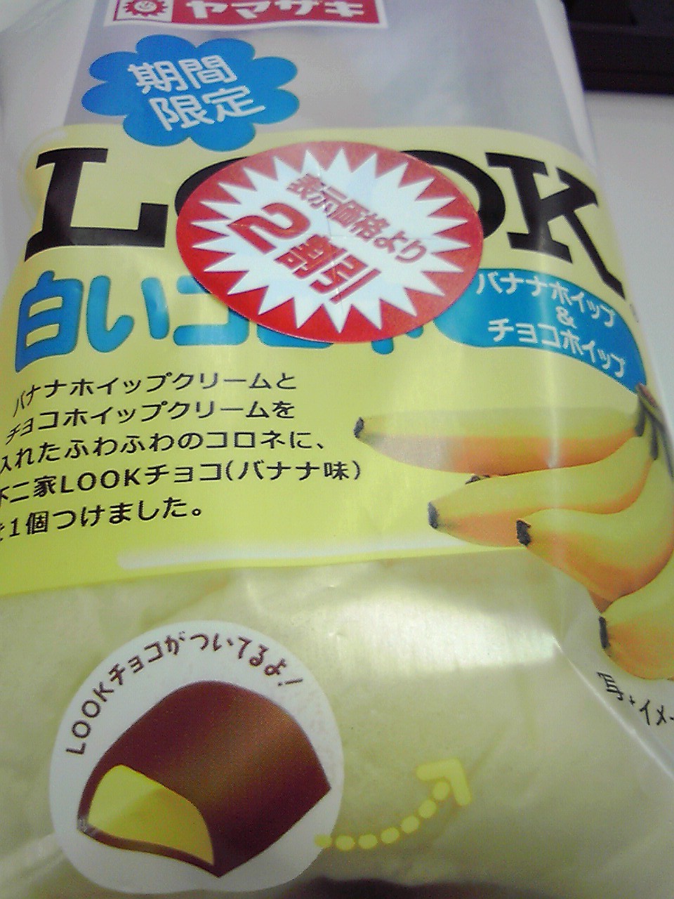 練習前の補食: ヤマザキ 白いコロネ(バナナホイップ&チョコホイップ)LOOKチョコレート使用(336kcal,たんぱく質5.3g,脂質16.4g,炭水化物41.9g)。そういえばヤマザキは不二家の筆頭株主なんだったな。ここをみると、山崎製パン株式会社の持株比率は51.00%(2010年12月31日現在)。それにしてもチョコレート1粒だけってのはケチくさい。