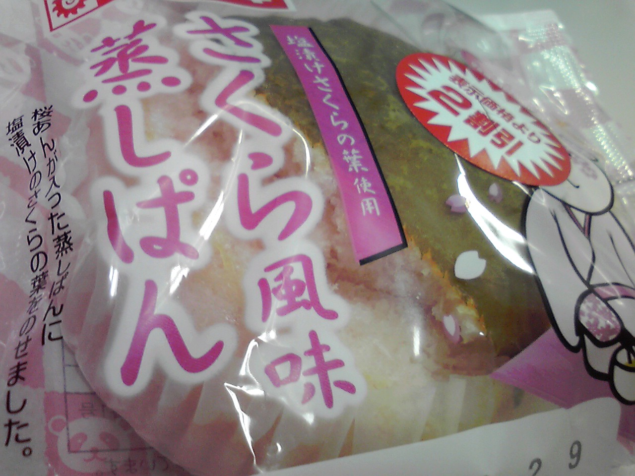 練習後の補食: プロテイン20g+コーヒー、ヤマザキ さくら風味蒸しぱん(塩漬けさくらの葉使用)(和生菓子;栄養価不明)。パッケージの外からは分からなかったが桜あんがたっぷり入っていてなかなかよい。パッケージもプラと紙を併用していてちょっと凝っている。