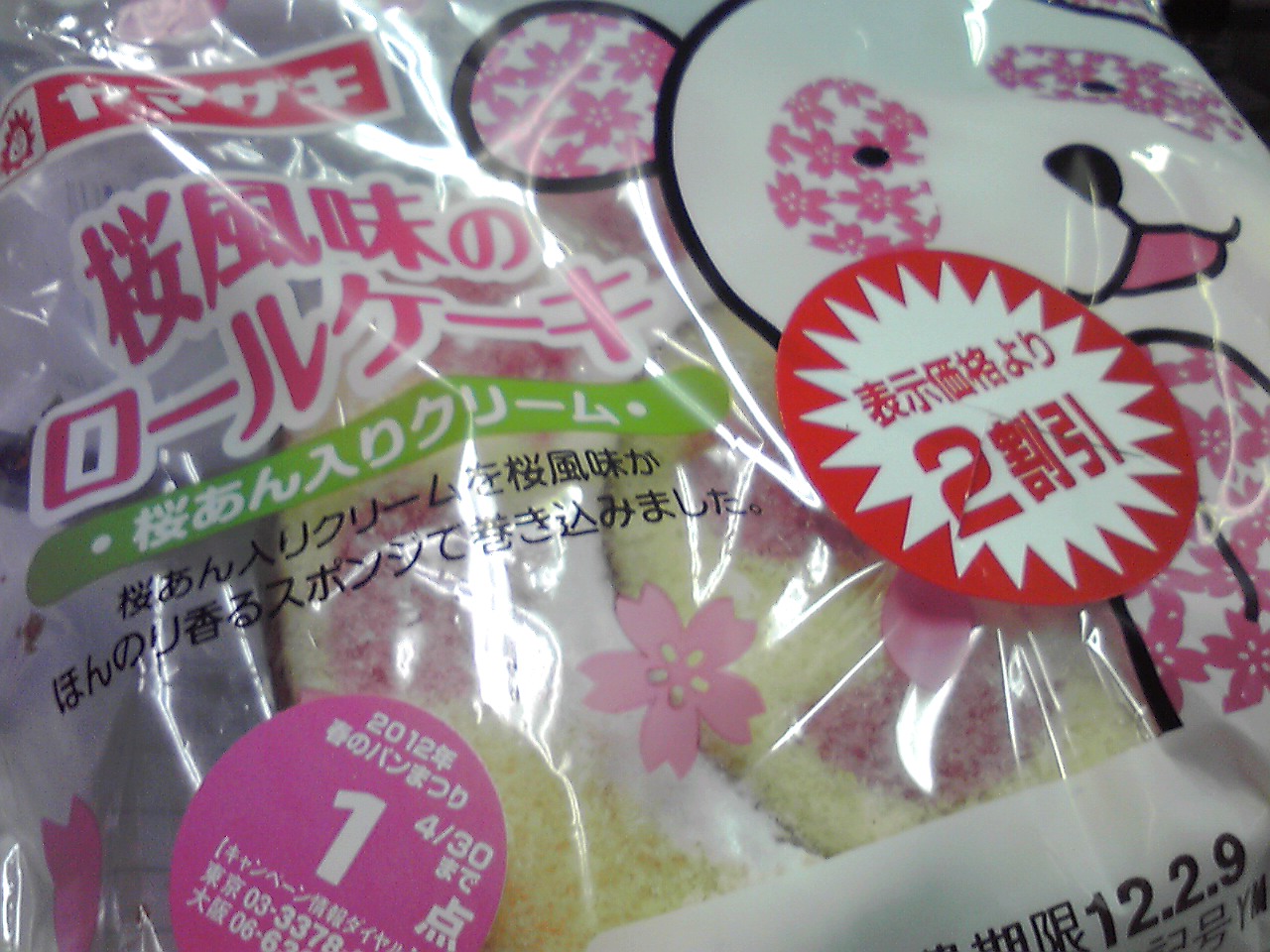 練習前の補食: ヤマザキ 桜風味のロールケーキ(桜あん入りクリーム)(442kcal,たんぱく質5.2g,脂質20.8g,炭水化物58.4g)。ちょっと油っこいかな。