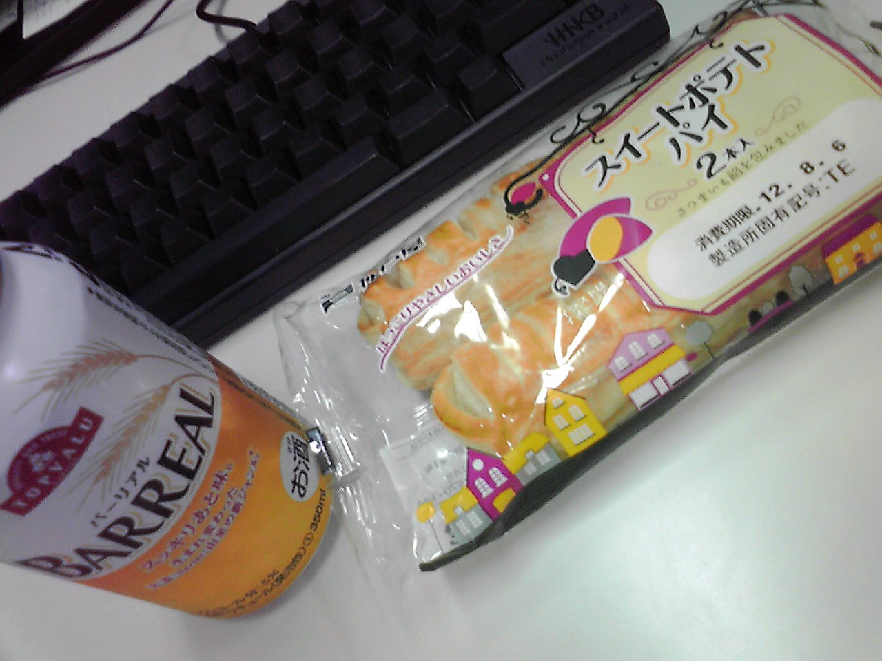 練習後の補食: プロテイン15g+砂糖, 神戸屋スイートポテトパイ2本入り(223kcal,たん白質2.6g,脂質11.3g,炭水化物28.0g*2)、topvalue barreall 350ml(151kcal)。