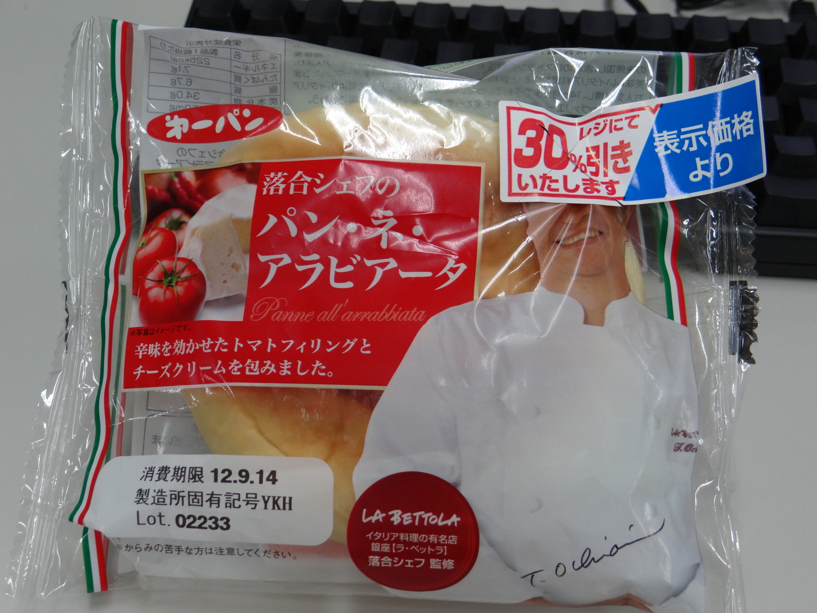 練習後の補食: プロテイン20g, 第一パン 落合シェフのパン・ネ・アラビアータ(225kcal,たんぱく質7.1g,脂質6.7g,炭水化物34.0g)。