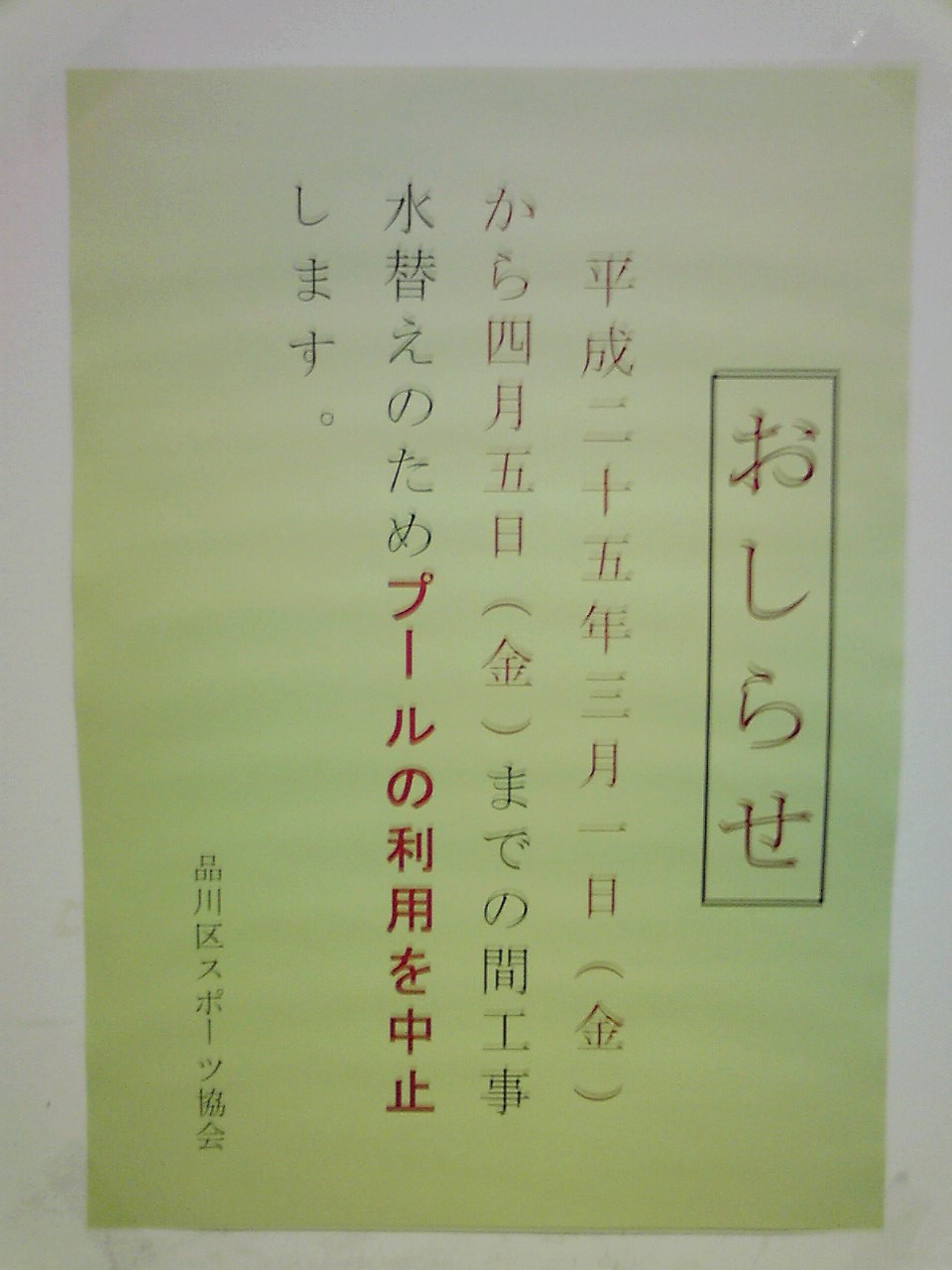 3月はプールが工事で閉まるみたいだ。どうしよう。4月の短水路大会に向けて練習は欠かせない時期だし。