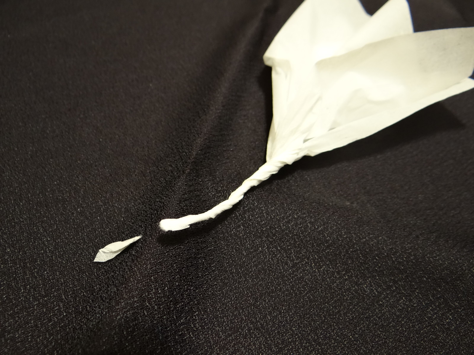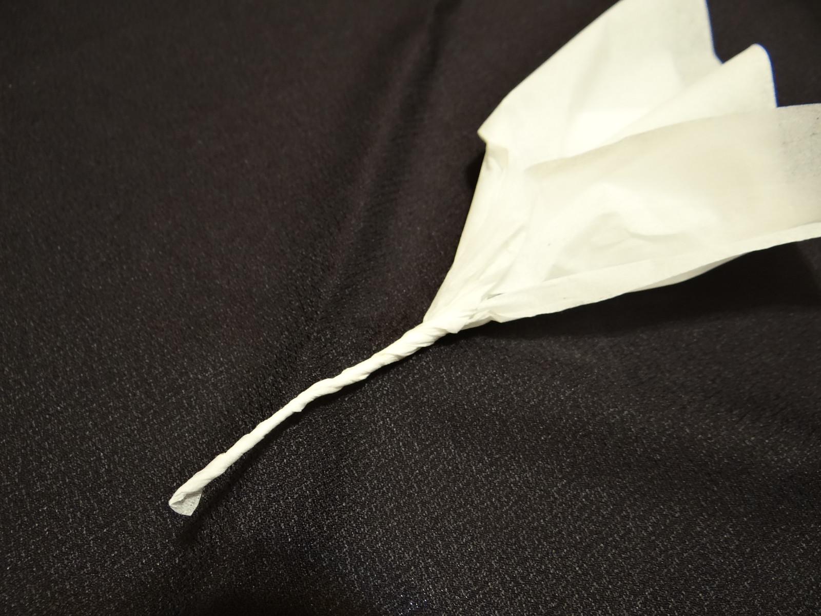 紙縒りにする。もし次の工程で先端をちぎらないなら、紙縒りの先端はゆるくしておく。