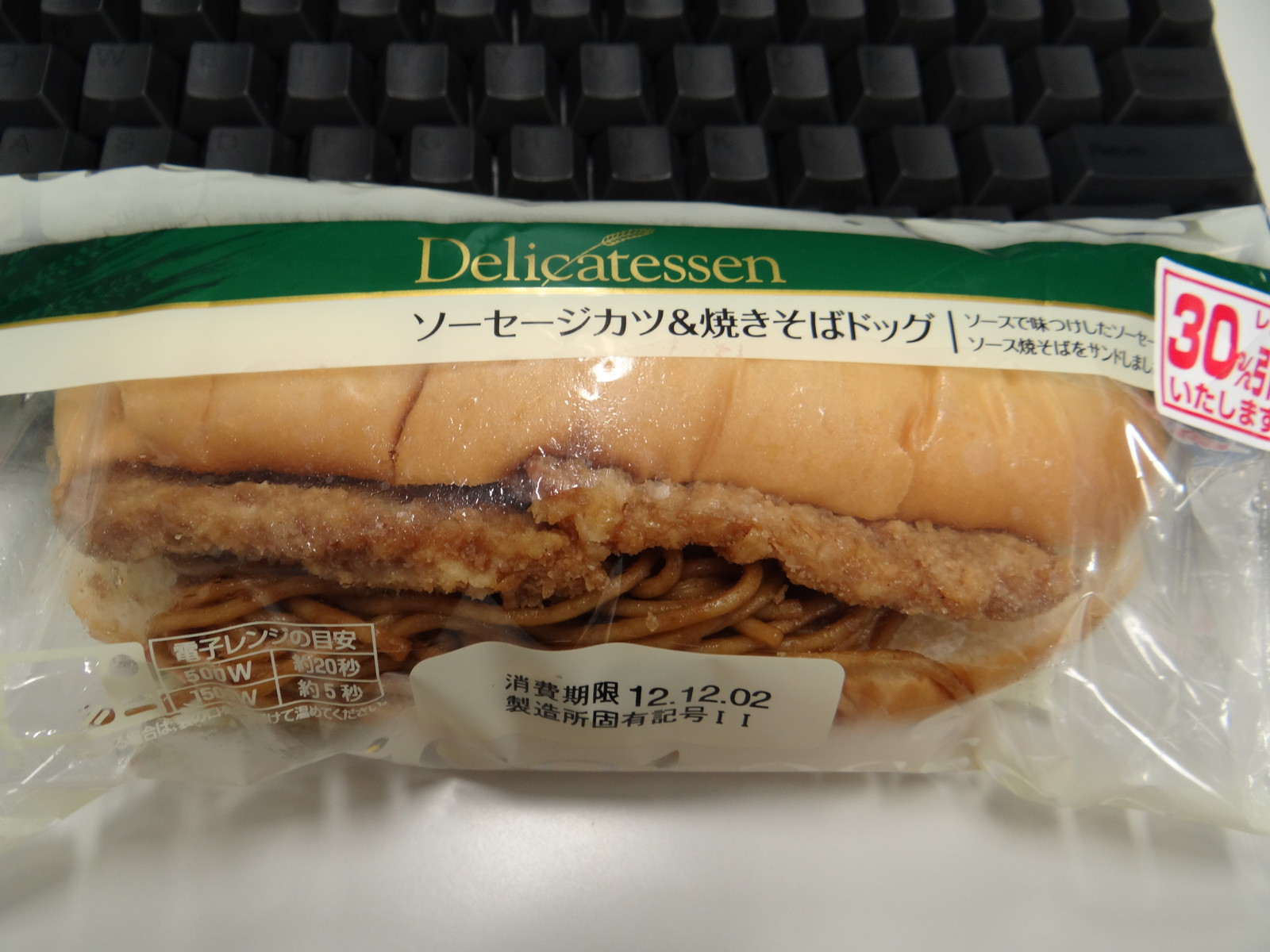 会社にもどって一服。伊藤製パン ソーセージカツ&焼きそばドッグ(386kcal,たんぱく質8.4g,脂質19.2g,炭水化物44.9g)、第一パン 大きなたまごデニッシュ(565kcal,たんぱく質10.0g,脂質40.7g,炭水化物38.8g)。
