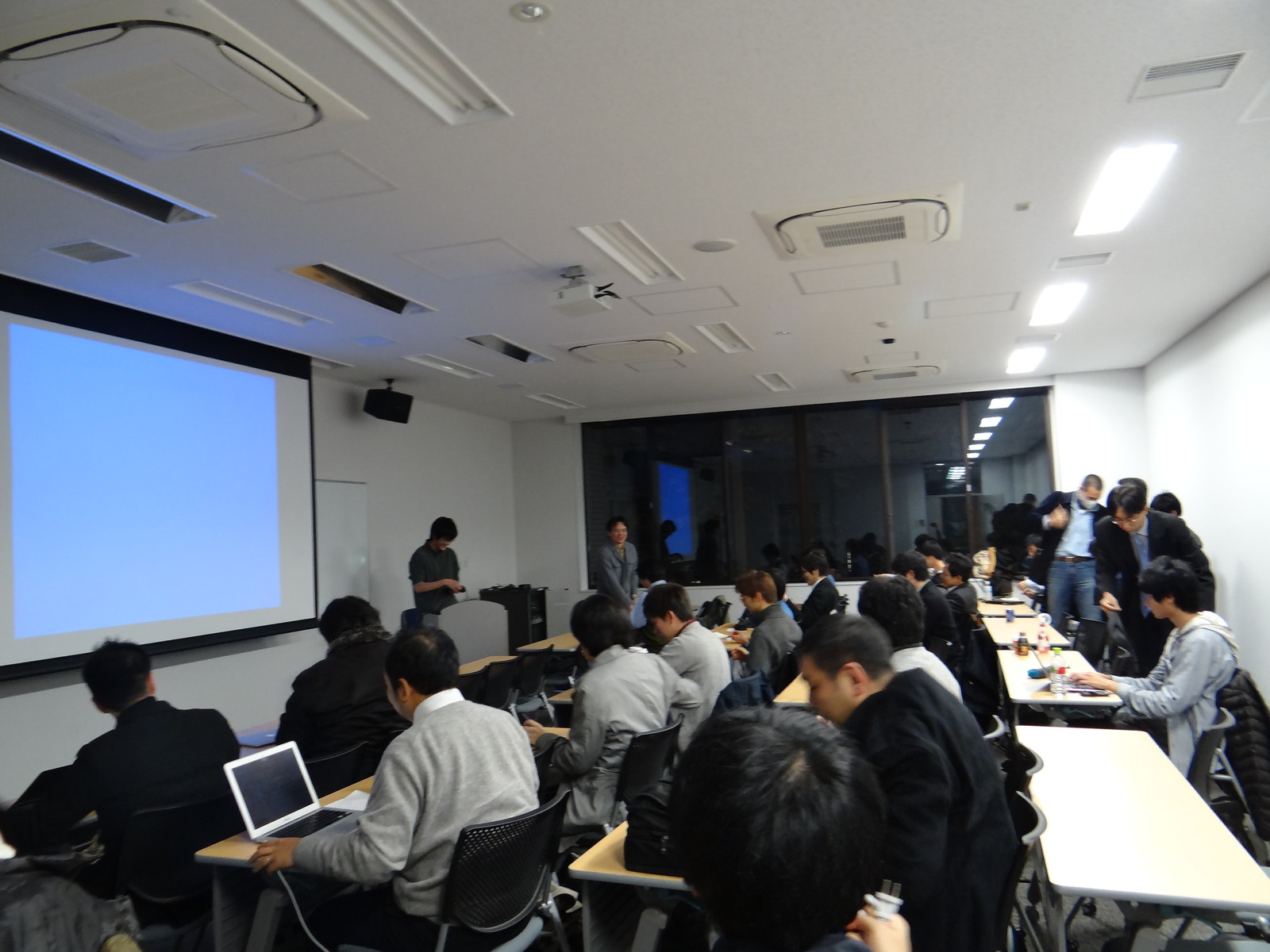 なんとか時間までに会場につけた。電源を取ろうとしたら電気がきてない。昼に復旧したが、どうやらブレーカーがトリップしてたようだ。(コーヒーメーカでもつかったか?)