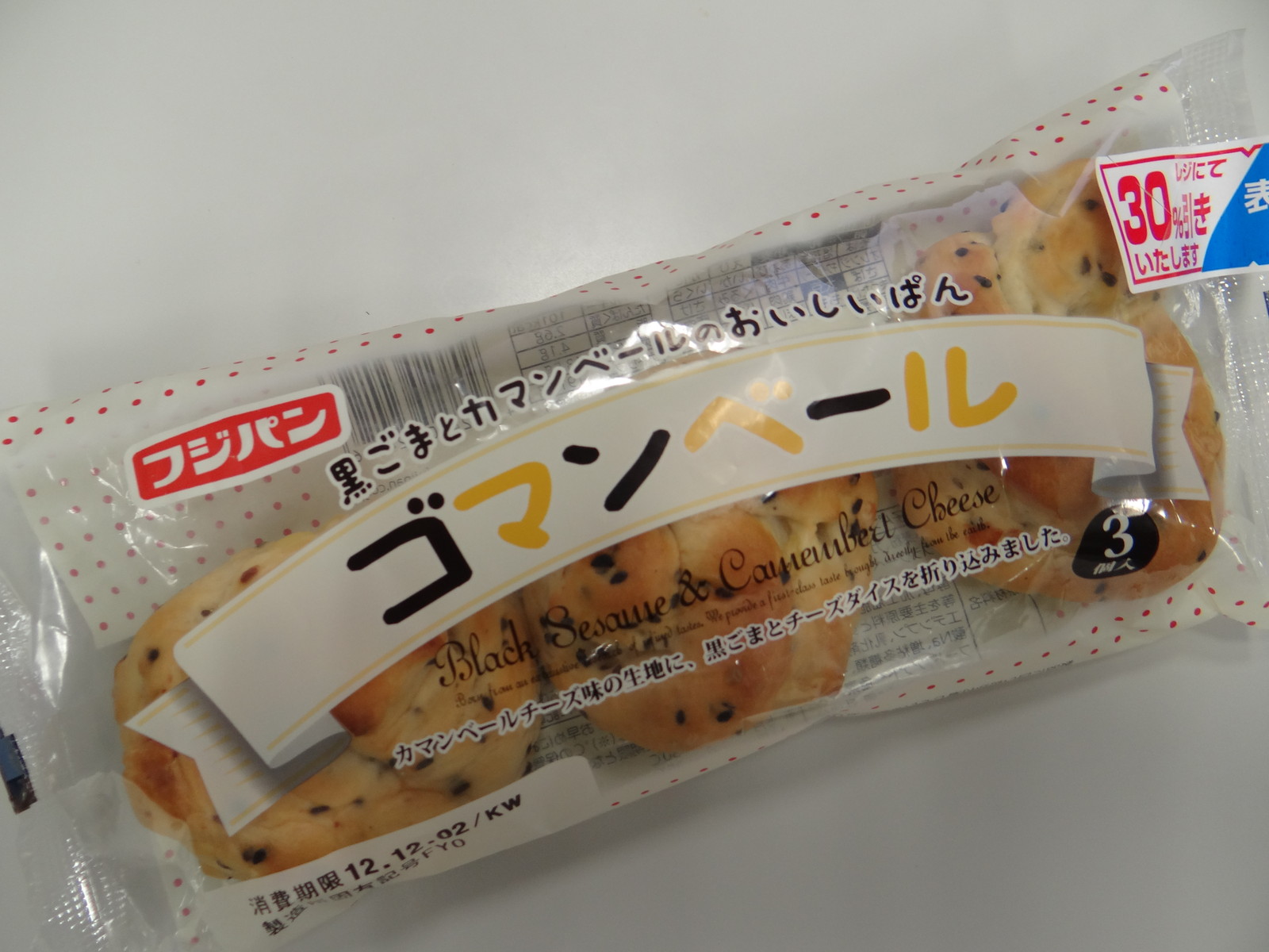 帰りは池袋経由で会社に戻って一服: フジパン ゴマンベール(101kcal,たんぱく質2.6g,脂質4.1g,炭水化物13.5g)*3。