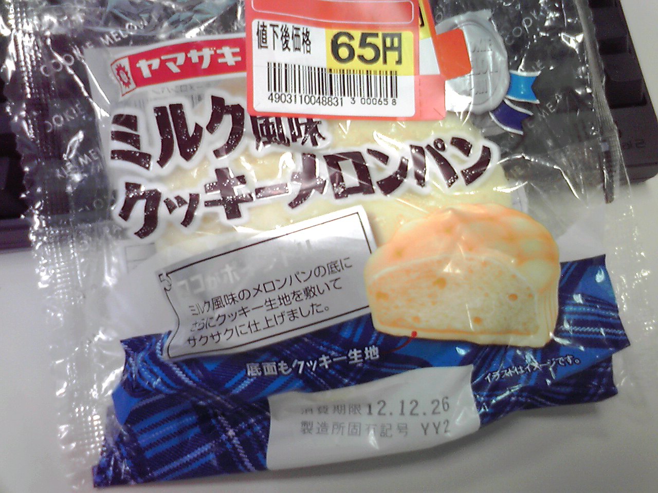 練習前の補食: ヤマザキ ミルク風味クッキーメロンパン(539kcal,たんぱく質8.7g,脂質15.5g,炭水化物91.2g)。