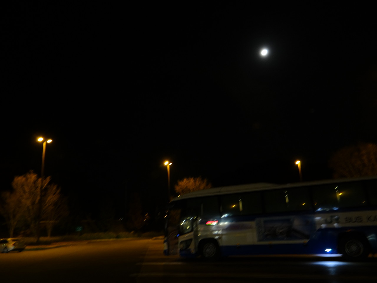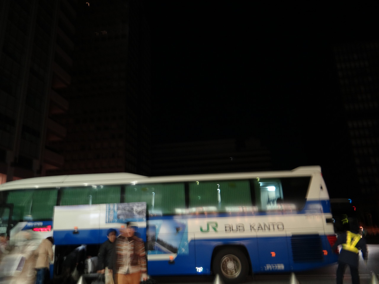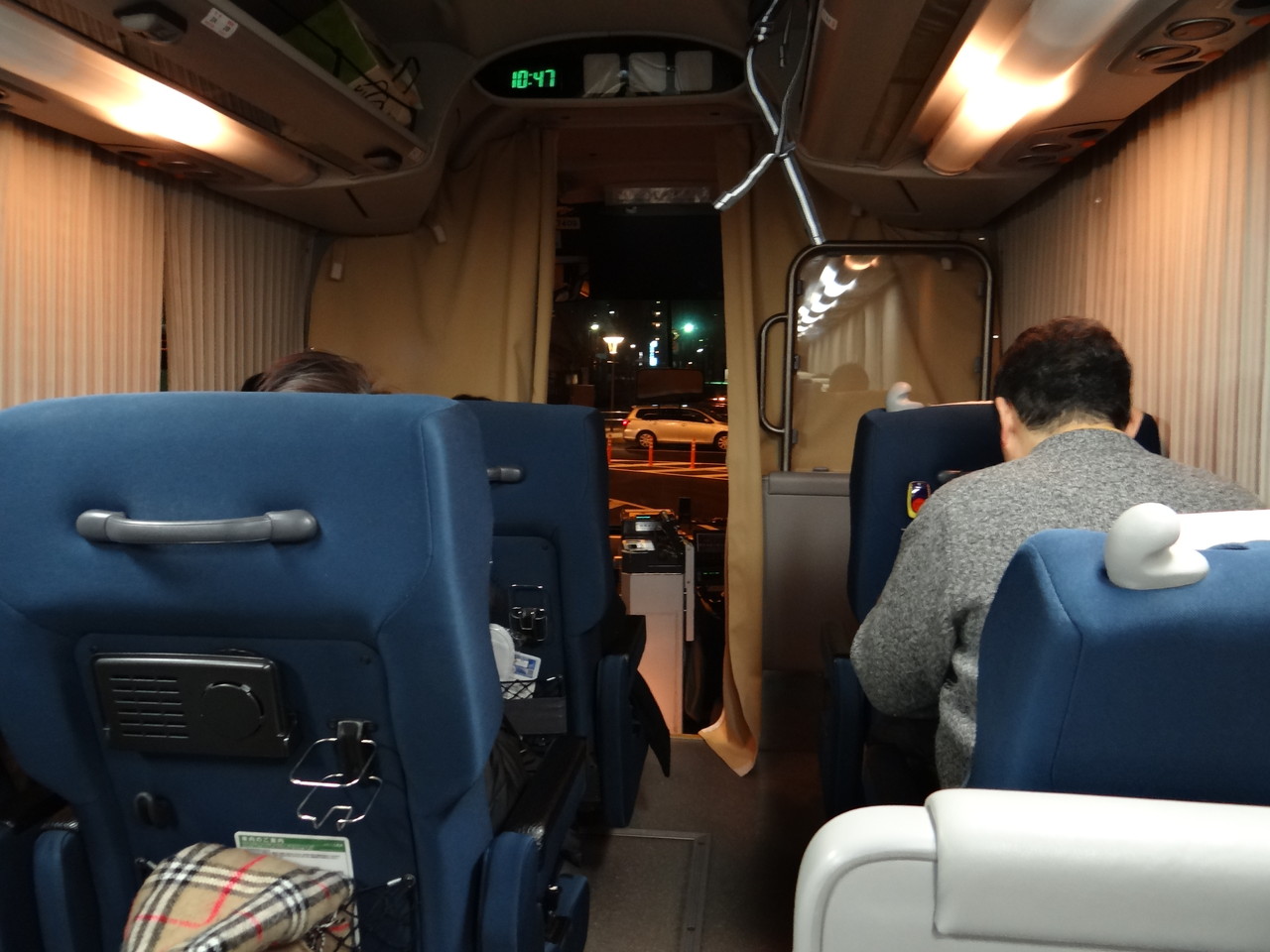 バスの座席は満席。空いてると一人で2席つかえてラクなんだけど、この時期にはありえないわな。意外と女性比率が多い。前2行は特別シートで3列だけど、普通シートは4列シート。中央ライナーに比べたらシート幅は広めのような気がする。シートはかなり倒れるが足が伸ばせないし、踏ん張るところがないのでだんだん体がずり落ちてくる。