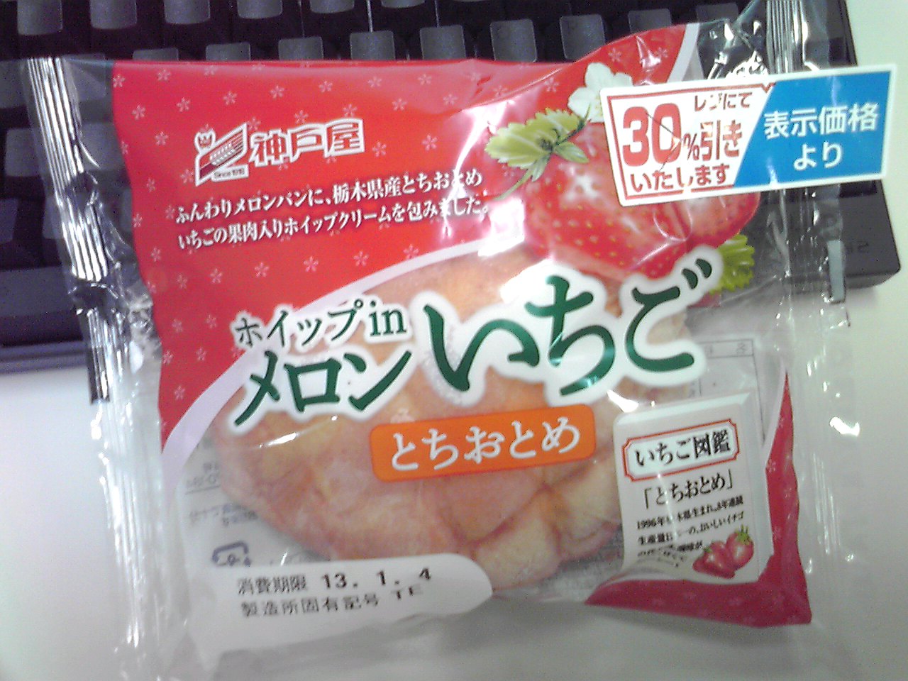 練習後の補食: 神戸屋 ホイップinメロンいちご(とちおとめ)(399kcal,たん白質6.3g,脂質13.8g,炭水化物63.2g)。