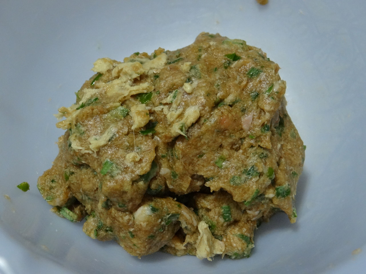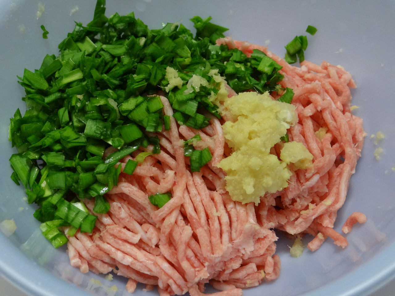 まずミンチに醤油生姜砂糖塩酒みりんにんにくをもみこんでから最後にキャベツとニラと混ぜます。