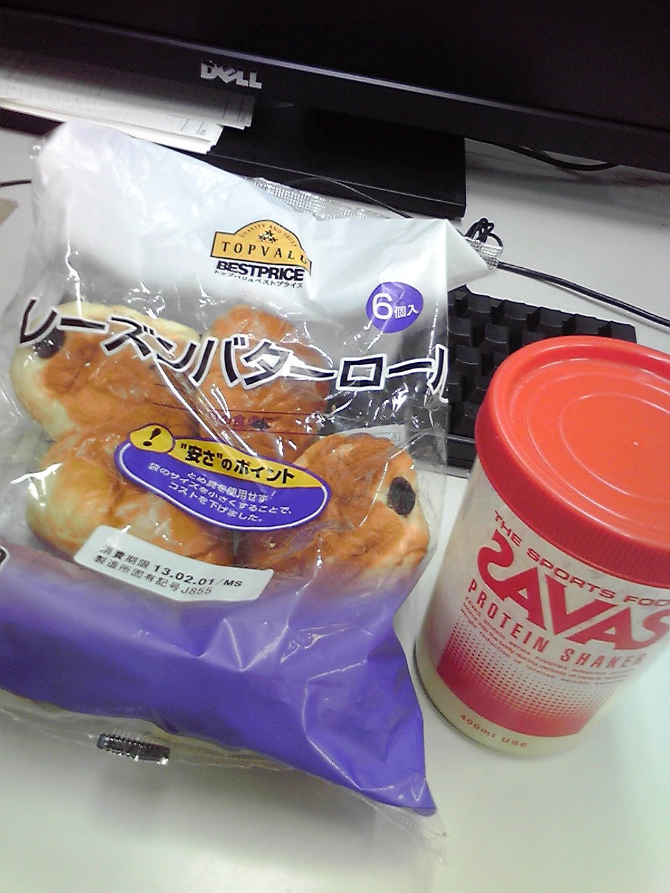 練習後の補食: プロテイン20g, レーズンバターロール(84kcal,たんぱく質2.3g,脂質2.4g,炭水化物13.1g)6個。