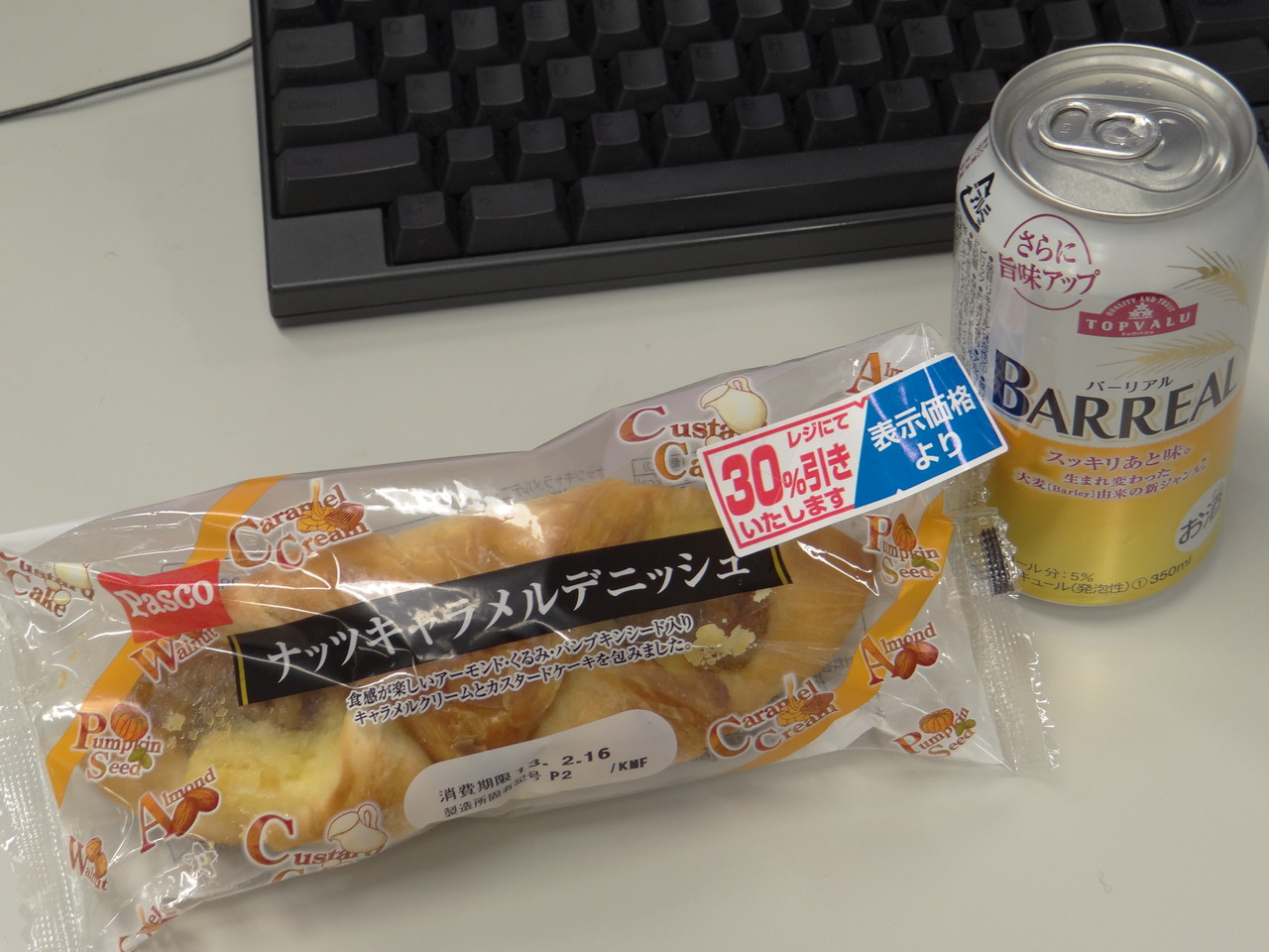 練習後の補食: プロテイン20g, Pasco ナッツキャラメルデニッシュ(392kcal,たんぱく質7.1g,脂質21.1g,炭水化物43.3g)、バーリアル(151kcal).