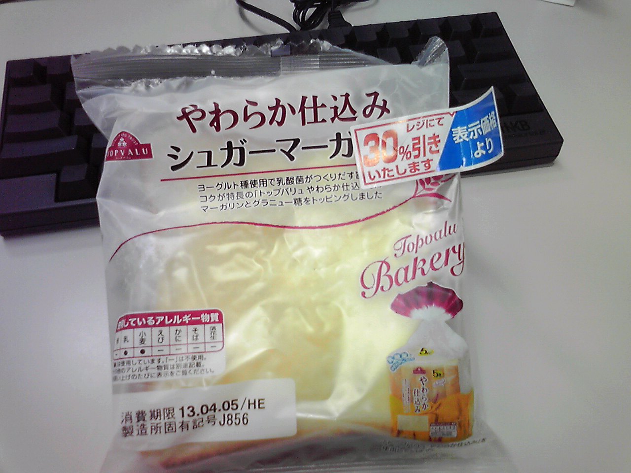 練習後の補食: プロテイン20g, うぐいす餅1個(あるきながら), topvalueやわらか仕込みシュガーマーガリン(314kcal,たんぱく質6.6g,脂質13.7g,炭水化物/糖質40.1g)。