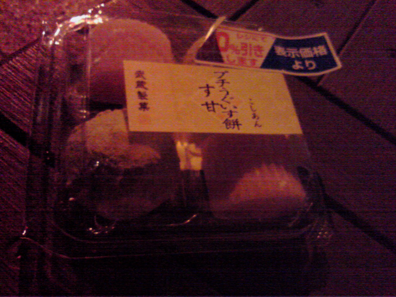 練習前の補食: 武蔵製菓プチうぐいす餅こしあん・す甘 3個(あるきながら)