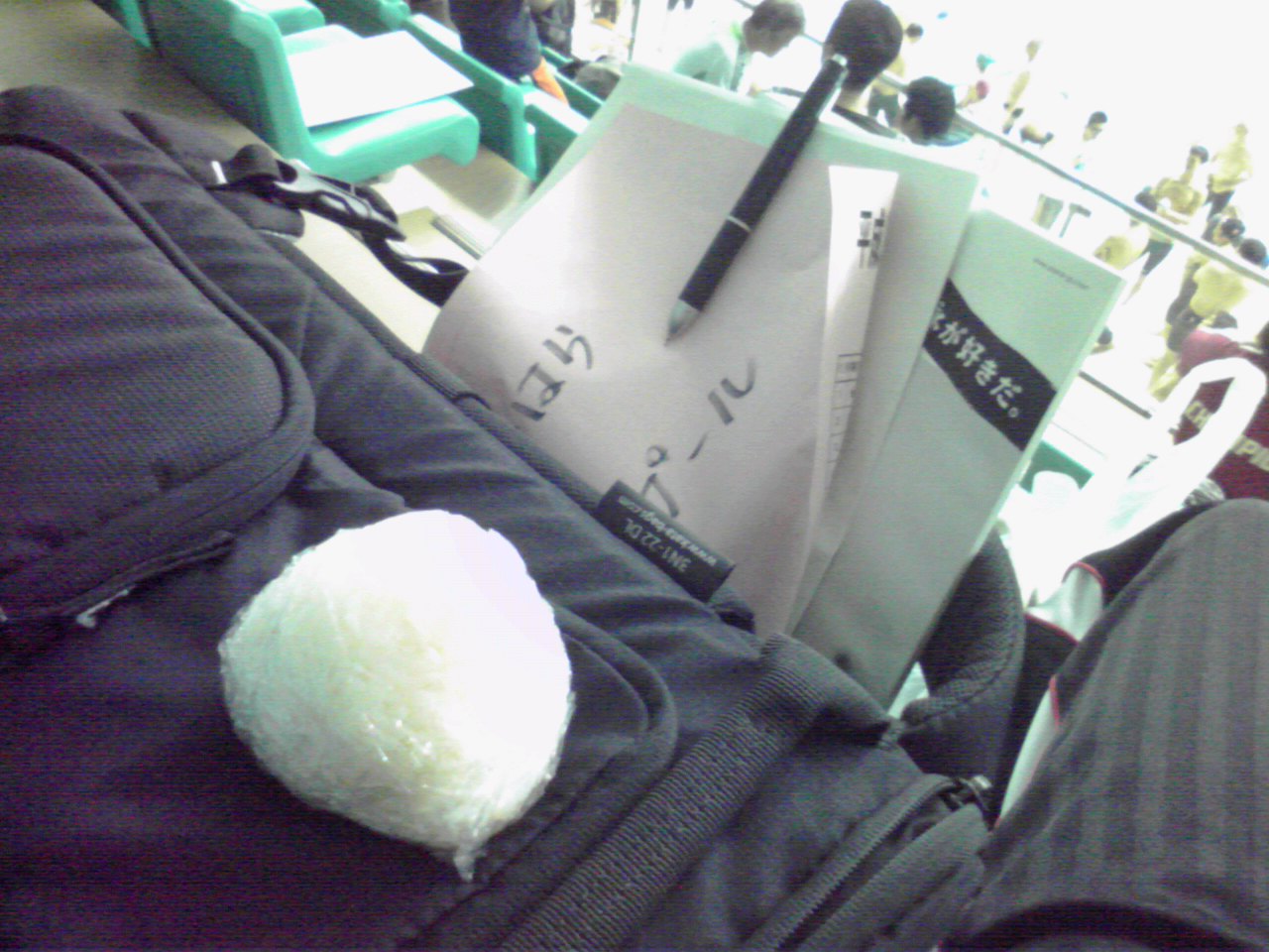 ダウンで50m泳いで観客席へ。とりあえず持ってきたオニギリをたべる。