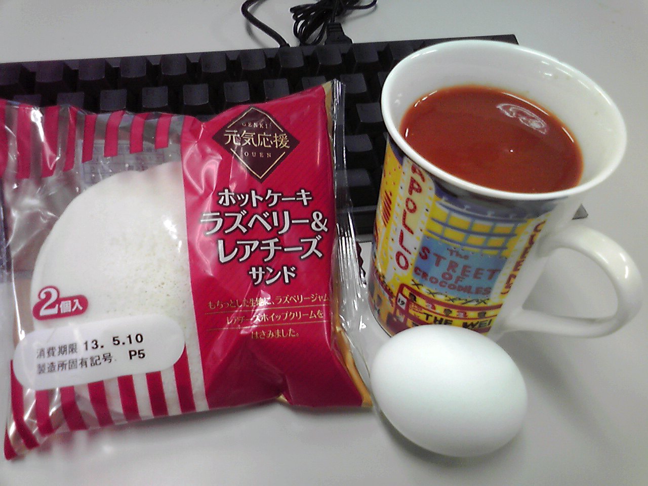 練習後の補食: 野菜ジュース、ゆで卵、敷島 元気応援ホットケーキラズベリー&レアチーズサンド2個入(187kcal,たんぱく質2.2g,脂質4.2g,炭水化物35.0g*2)。