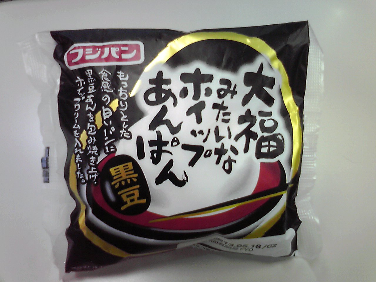 練習後の補食: フジパン 大福みたいなヒイップあんぱん黒豆(301kcal,たんぱく質6.7g,脂質9.0g,炭水化物48.4g).