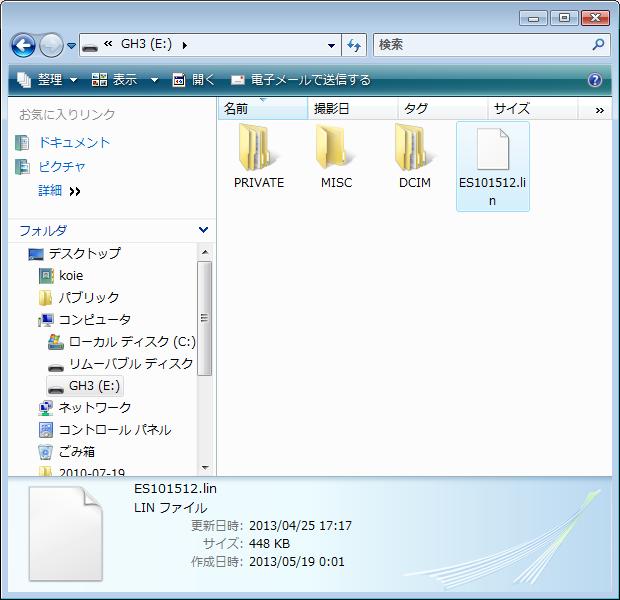 Windows用の実行ファイルをダウンロードして、実行すると解凍されてES101512.linができて、それをSDカードにコピーして、GH3の電源入れて再生ボタンを押すとアップデート開始。アップデートがおわったらSDカードにコピーしたES101512.linを消して終了。