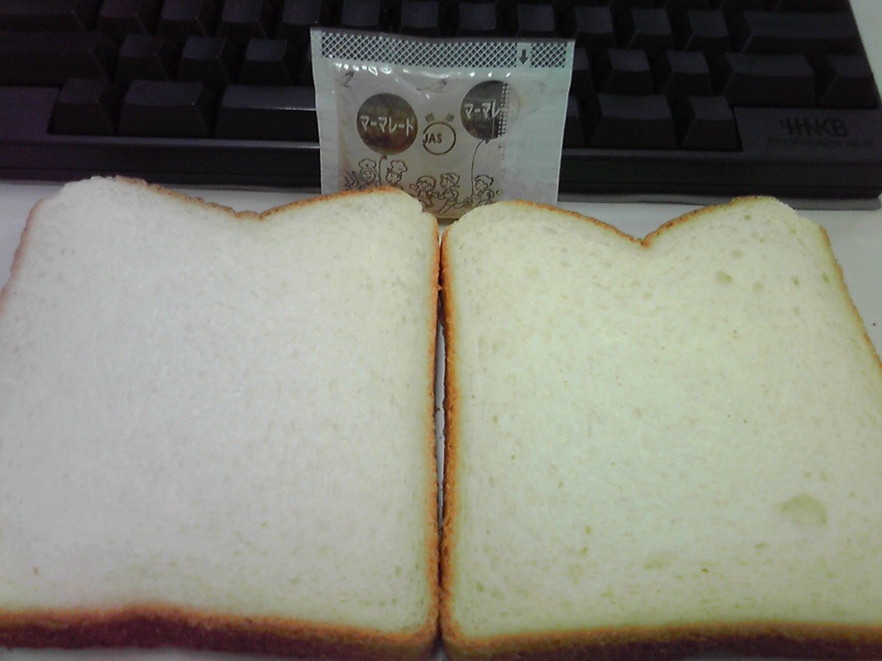 練習後の補食: 大豆ペプチド数グラム、TVやわらか仕込み食パン(8枚切)2枚(@122kcal,たんぱく質4.0g,脂質2.0g,炭水化物21.4g)、オレンジマーマレード。