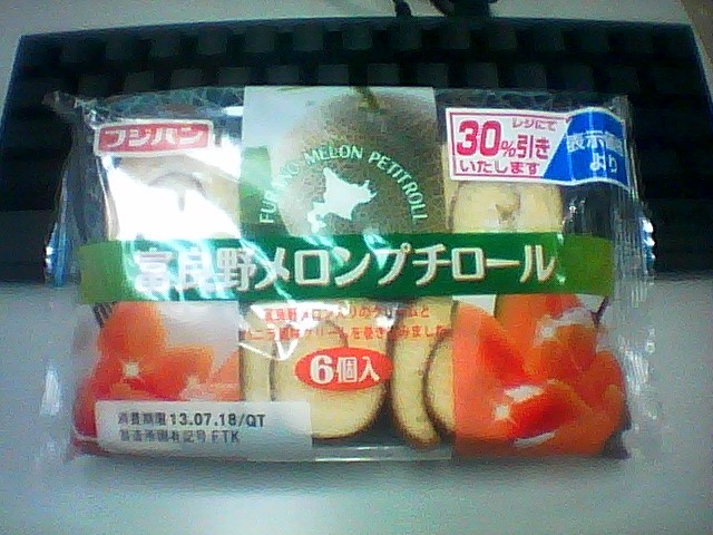 練習後の補食: 大豆ペプチド数グラム、フジパン富良野メロンプチロール(75kcal,たんぱく質1.3g,脂質2.5g,炭水化物11.7g)。